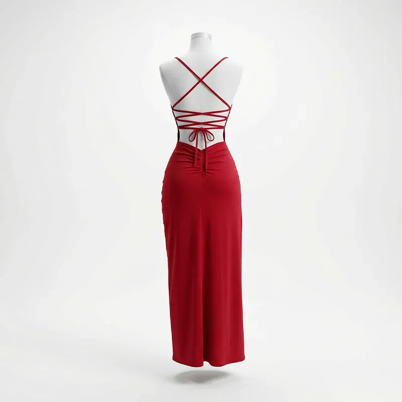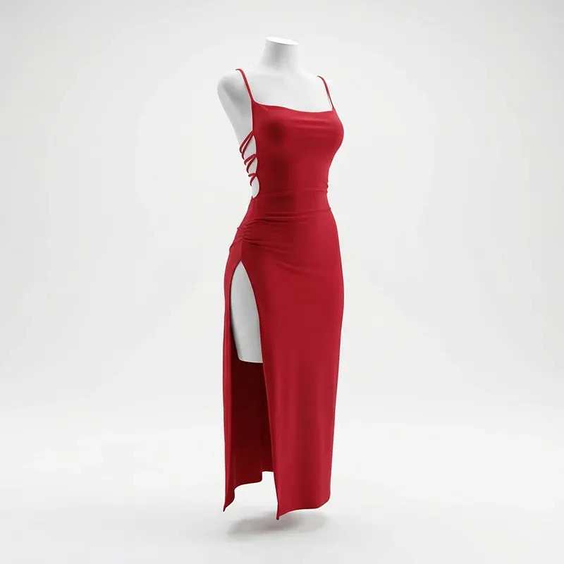 This dress combines edginess with elegance, making it perfect for a night out. The backless design adds a sultry touch, enhancing the overall appeal. Spaghetti straps offer a delicate and feminine silhouette, beautifully balancing the bold features. Crafted from high-quality materials, it ensures comfort throughout the evening. Pair the dress with elegant heels and accessories to complete the captivating look.