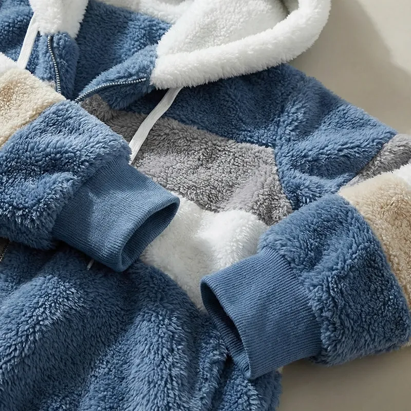 Stay snug through chilly seasons in this hooded plush coat that radiates cosiness. Luxurious fur lining ensures lasting insulation without bulk or discomfort. It provides cloudlike softness under harsh winter conditions. The generous hood shields against biting wind while the collar offers extra coverage. Oversized design ensures layering ease and unrestricted movement.